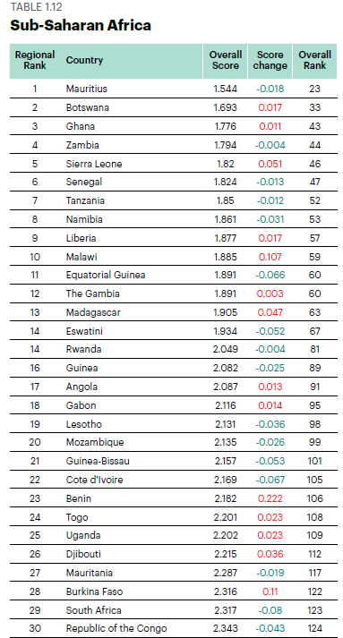 According to the 14th edition of the ranking of the IEP, Ghana moved up one place from the 2019 GPI and it is now behind only Mauritius (1st) and Botswana (2nd) in sub-Saharan Africa, while South Sudan remains the least peaceful country in sub-Saharan Africa.