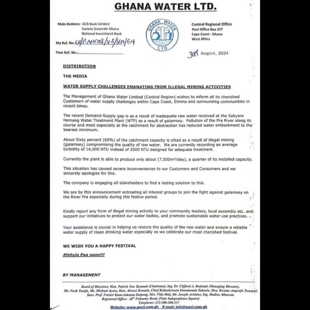 “The company is engaging all stakeholders to find a lasting solution to this. We are by this announcement entreating all interest groups to join the fight against galamsey on the River Pra, especially during this festive period. Kindly report any form of illegal mining activity to your community leaders, local assembly, etc., and support our initiatives to protect our water bodies and promote sustainable water use practices.”