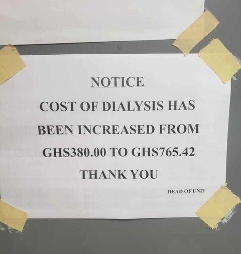 A notice from the Renal Department of the hospital informing the public about an increment in the cost of renal dialysis from GH¢380 to GH¢765.42 went viral on social media.
