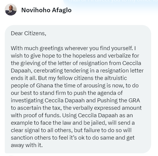 In a Twitter post, he stated that the Ghanaian authorities using Cecilia Dapaah as an example to face the law and subsequently jailed will send a clear signal to others adding that failure to do so will "sanction others to feel that it's ok to do same and get away with it."