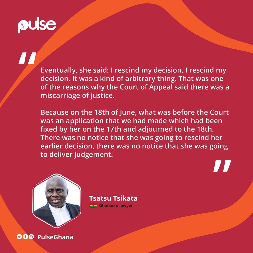 Frantically trying to salvage all loose ends with the Supreme Court case in the exchanges that followed the Judge rescinding her decision to wait, Tsatsu failed to have a breakthrough as Mrs Justice Henrrieta Abban went ahead with her ruling.