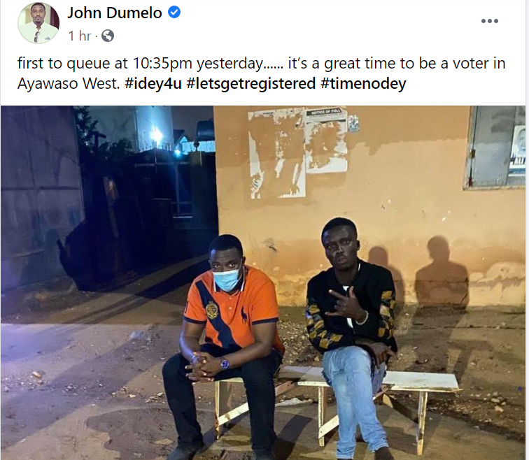 “First to queue at 10:35pm yesterday...... it’s a great time to be a voter in Ayawaso West,” he wrote.