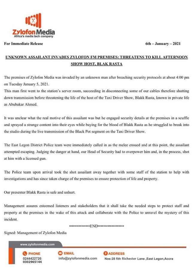 "This man first went to the station's server room, succeeding in disconnecting some of our cables, therefore, shutting down transmission before threatening the life of the host of the Taxi Driver Show, Blakk Rasta, known in private life as Abubakar Ahmed," a section of the statement said.
