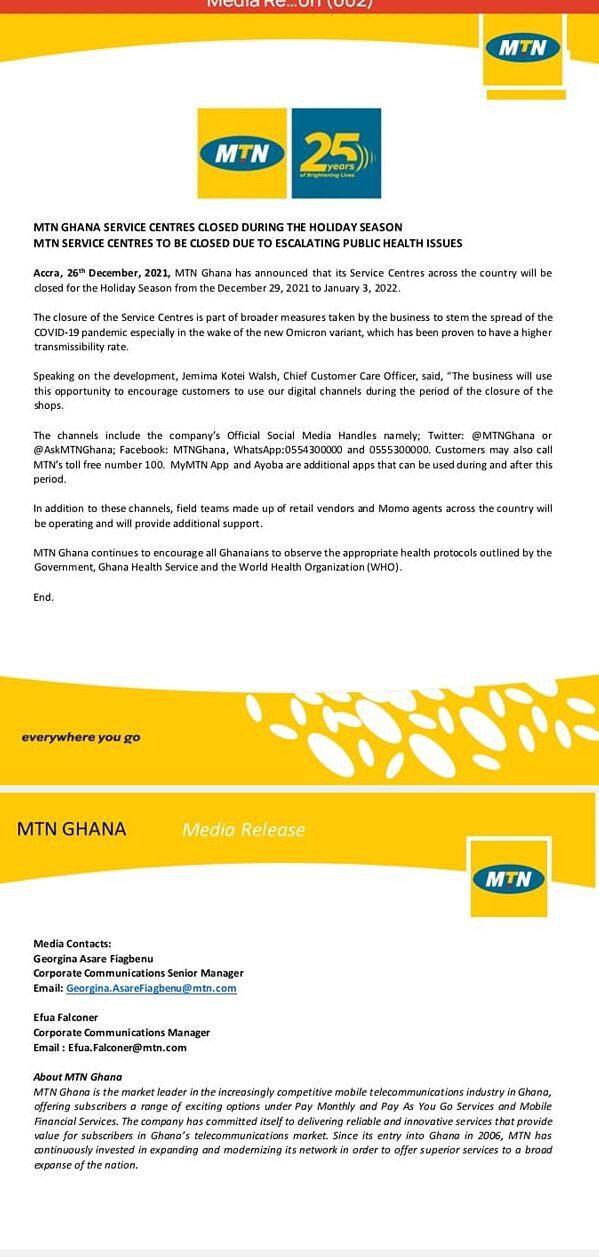 In a statement released on Sunday, December 26, MTN said: “The closure of the Service Centres is part of broader measures taken by the business to stem the spread of the COVID-19 pandemic especially in the wake of the new Omicron variant, which has been proven to have a higher transmissibility rate.”