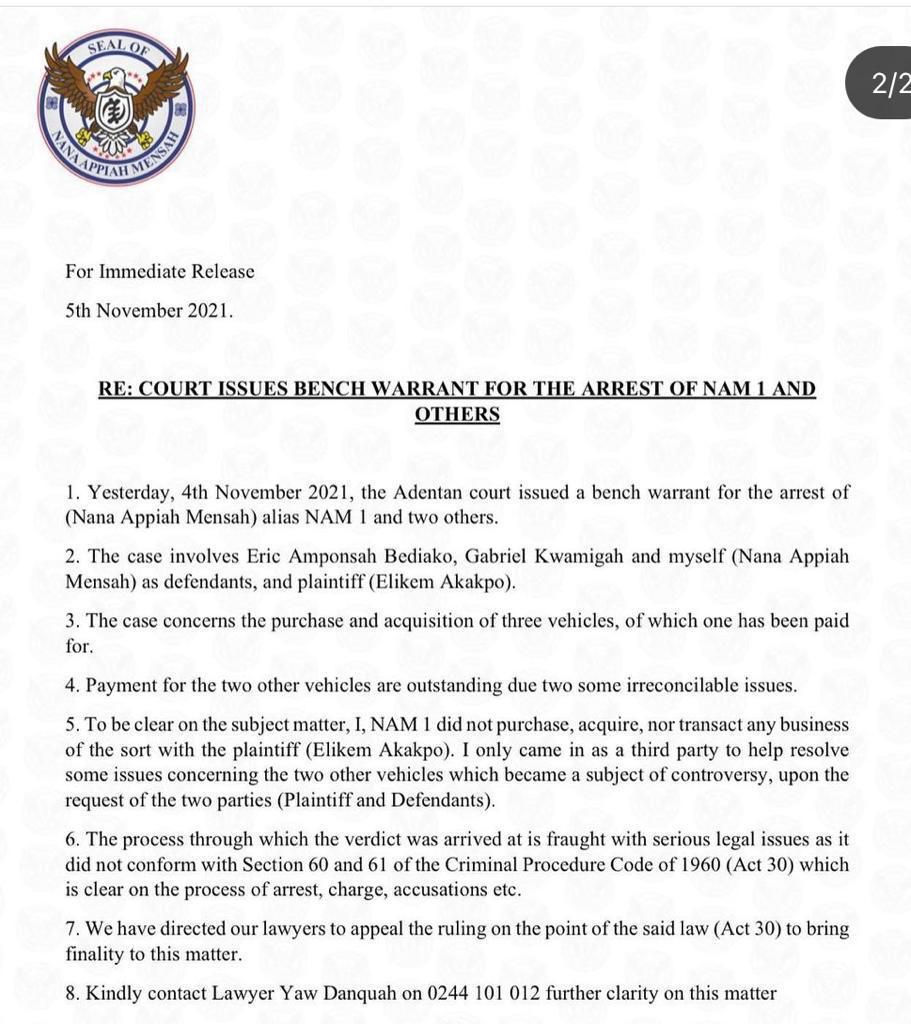 Nana Appiah Mensah, popularly known as ‘NAM 1’ has directed his lawyers to appeal <a href="https://www.pulse.com.gh/news/local/court-issues-bench-warrant-to-arrest-nam1-and-2-others/ej29rdp">the bench warrant issued by the Adentan Circuit Court for his arrest</a>, describing it as illegal.