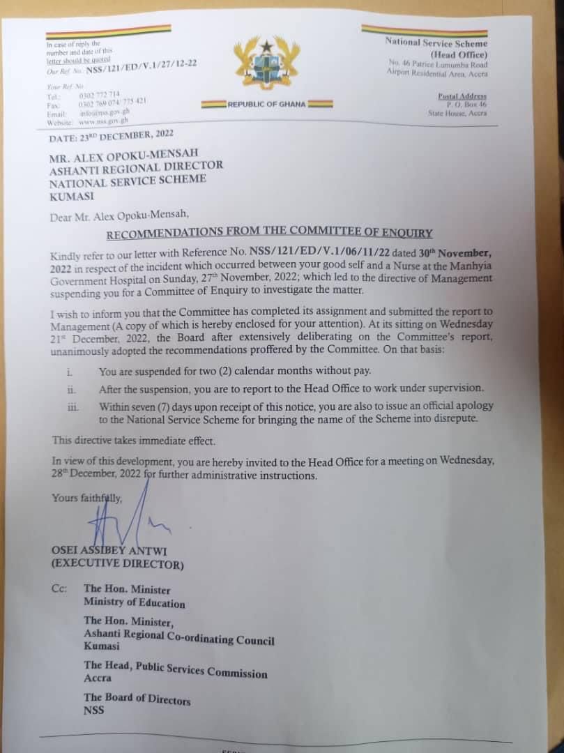 In a new directive captured in a letter dated December 23, 2022, Mr. Opoku-Mensah will report to the Head Office of the Secretariat after the suspension.