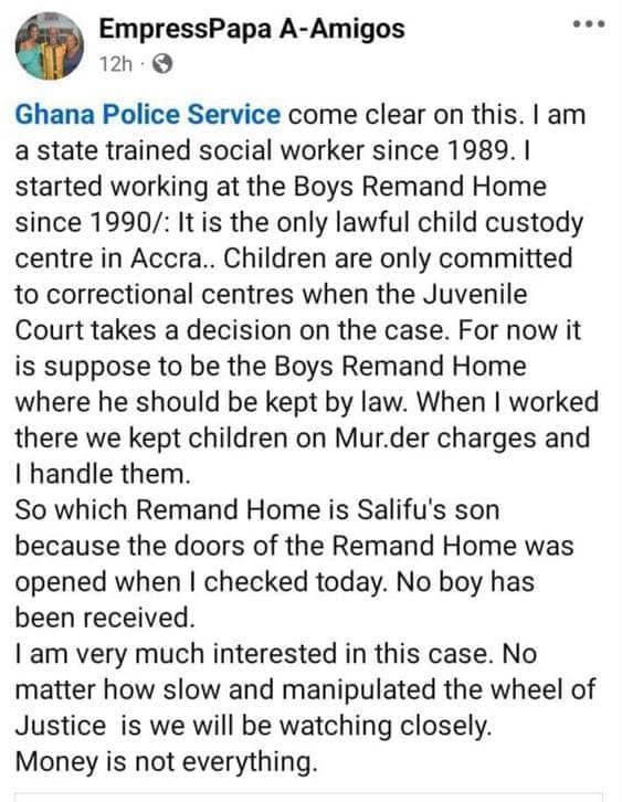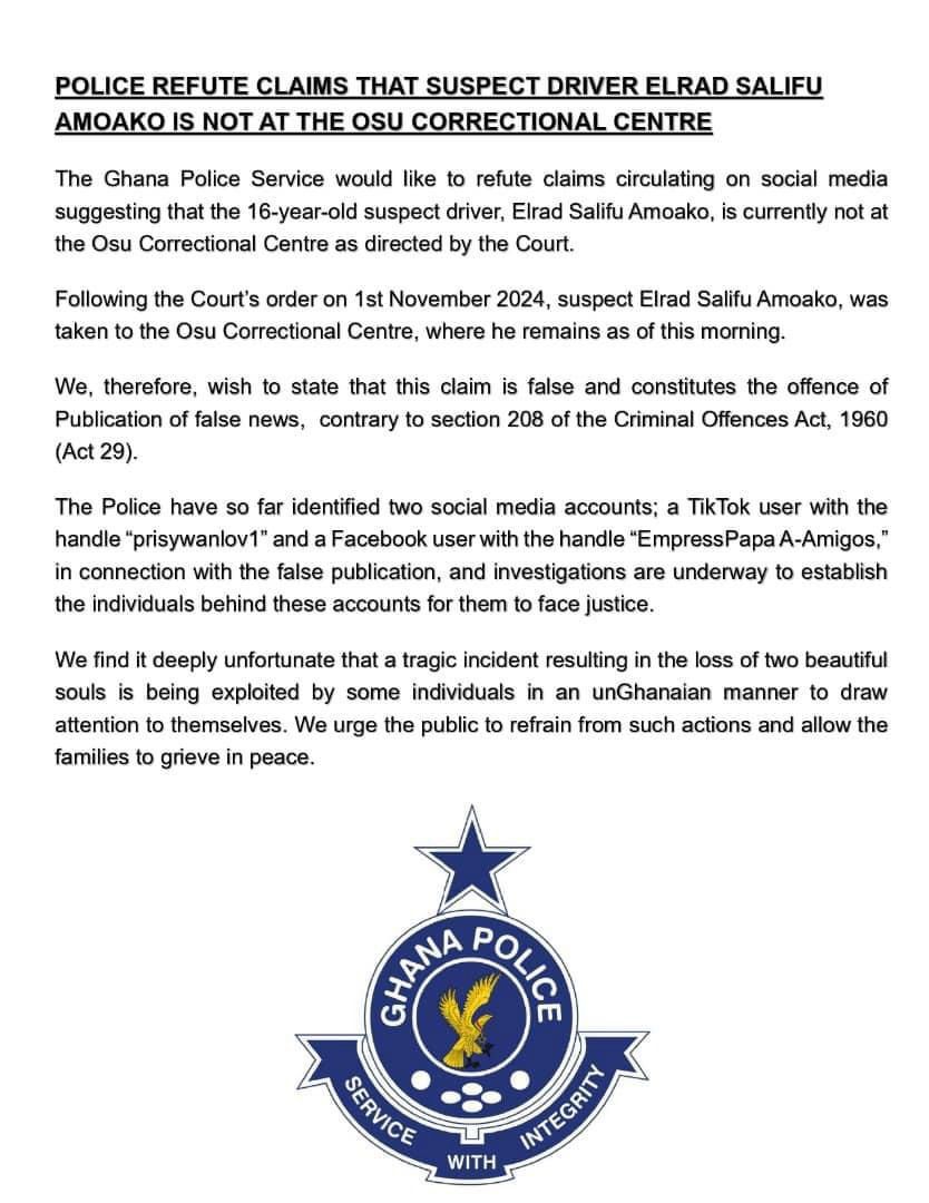 "The Ghana Police Service would like to refute claims circulating on social media suggesting that the 16-year-old suspect driver, Elrad Salifu Amoako, is currently not at the Osu correctional centre as directed by the Court.