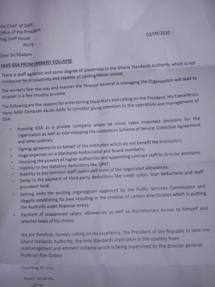 A petition addressed to the Chief of staff to the President said "some degree of uneasiness in the Ghana Standards Authority which is not conducive for productivity and is capable of causing labour unrest" adding that the authority will collapse if the President doesn't intervene.