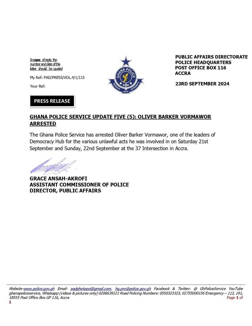 According to a press release issued by the Public Affairs Directorate of the Police Headquarters, on Monday, September 23, 2024, Barker Vormawor was apprehended for his involvement in these illegal acts. The arrest is part of the police’s ongoing efforts to maintain law and order in the capital city.