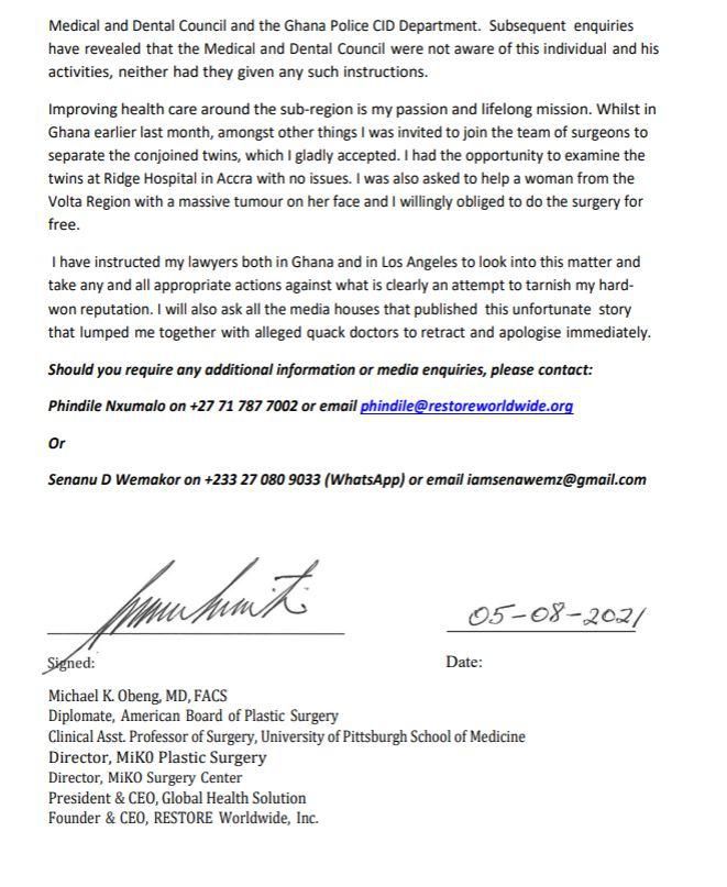 The report cited the MDC as saying that Dr. Obeng was also soliciting for clients for media consultation in cosmetic surgery in a hotel; something which is against the professional expectation and the Health Professions Regulatory Bodies Act 2013 (Act 857).