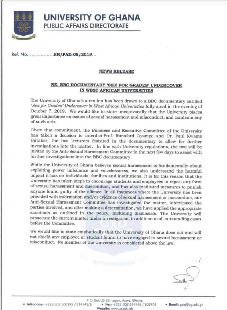 “The University of Ghana’s attention has been drawn to a BBC documentary entitled “Sex for Grades” Undercover in West African Universities fully aired in the evening of October7, 2019,” the statement reads.