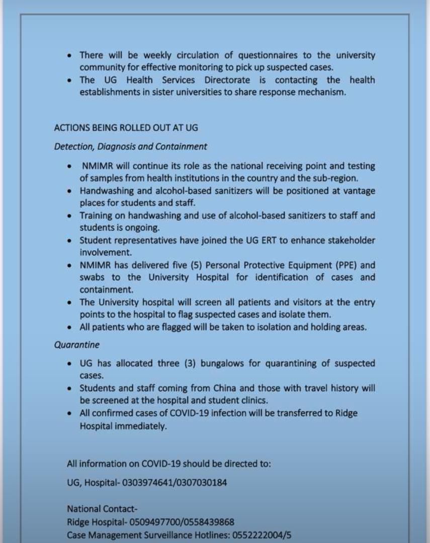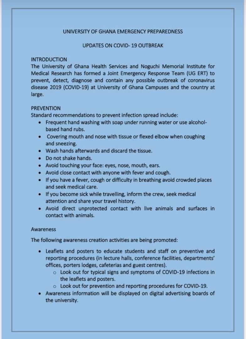 The university has formed a Joint Emergency Response Team (UG ERT) with personnel from its health services department and the Noguchi Memorial Institute for Medical Research to detect, diagnose and contain any possible outbreak of the coronavirus disease.