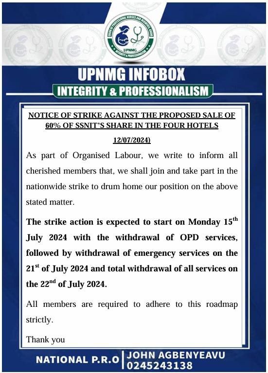 In solidarity, the UPNMG issued a statement titled "Notice of Strike Against the Proposed Sale of 60% of SSNIT's Share in the Four Hotels," confirming their involvement in the strike.