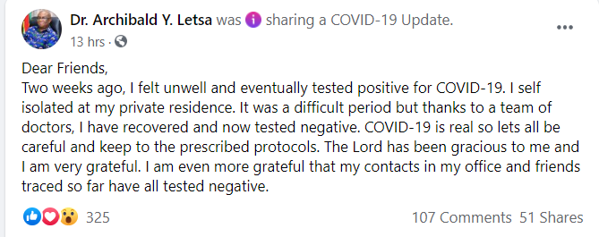 “COVID-19 is real so let’s all be careful and keep to the prescribed protocols. The Lord has been gracious to me and I am very grateful. I am even more grateful that my contacts in my office and friends traced so far have all tested negative,” Dr. Letsa added.