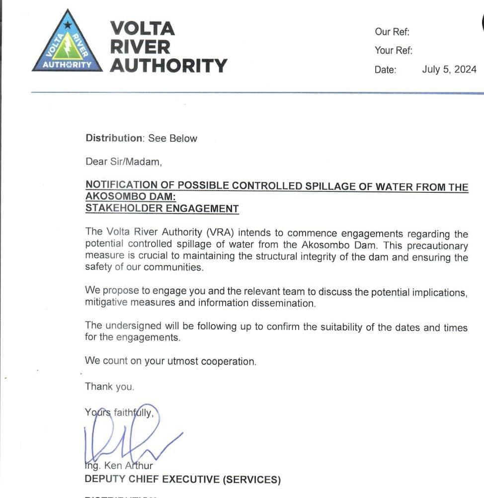 “The Volta River Authority (VRA) intends to commence engagements regarding the potential controlled spillage of water from the Akosombo Dam. This precautionary measure is crucial to maintaining the structural integrity of the dam and ensuring the safety of our communities,” the notice stated. It further noted, “We propose to engage you and the relevant team to discuss the potential implications, mitigative measures, and information dissemination.”