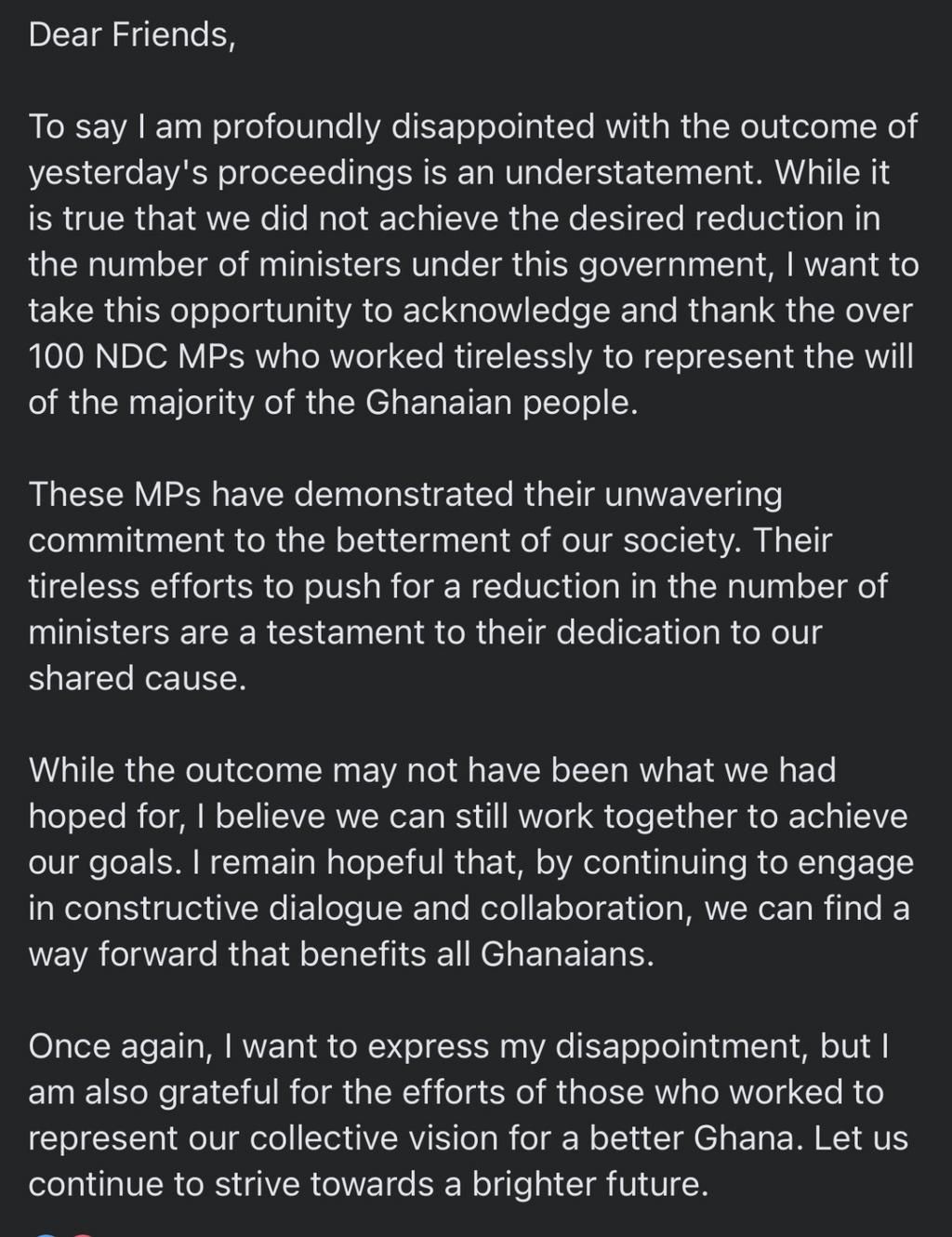 In his statement, the minority leader said “To say I am profoundly disappointed with the outcome of yesterday’s proceedings is an understatement. While it is true that we did not achieve the desired reduction in the number of ministers under this government, I want to take this opportunity to acknowledge and thank the over 100 NDC MPs who worked tirelessly to represent the will of the majority of the Ghanaian people,”