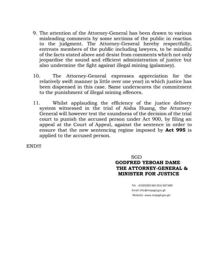 “Whilst applauding the efficiency of the justice delivery system witnessed in the trial of Aisha Huang, the Attorney General will however test the soundness of the decision of the trial court to punish the accused person under Act 900, by filing an appeal at the Court of Appeal, against the sentence to ensure that the new sentencing regime imposed by Act 995 is applied to the accused person,” the AG’s statement read in part.