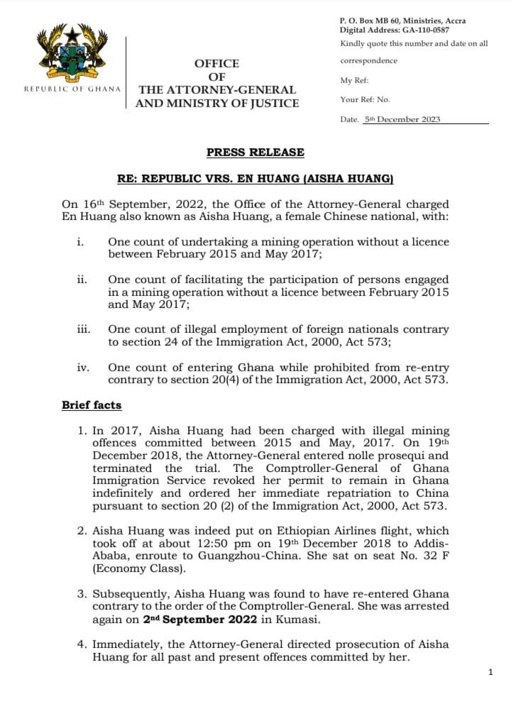 According to the AG, the intended appeal process aims to test the appropriateness of the trial judge’s decision to sentence Aisha Huang, under the Minerals and Mining (Amendment) Act, 2015 (Act 900).