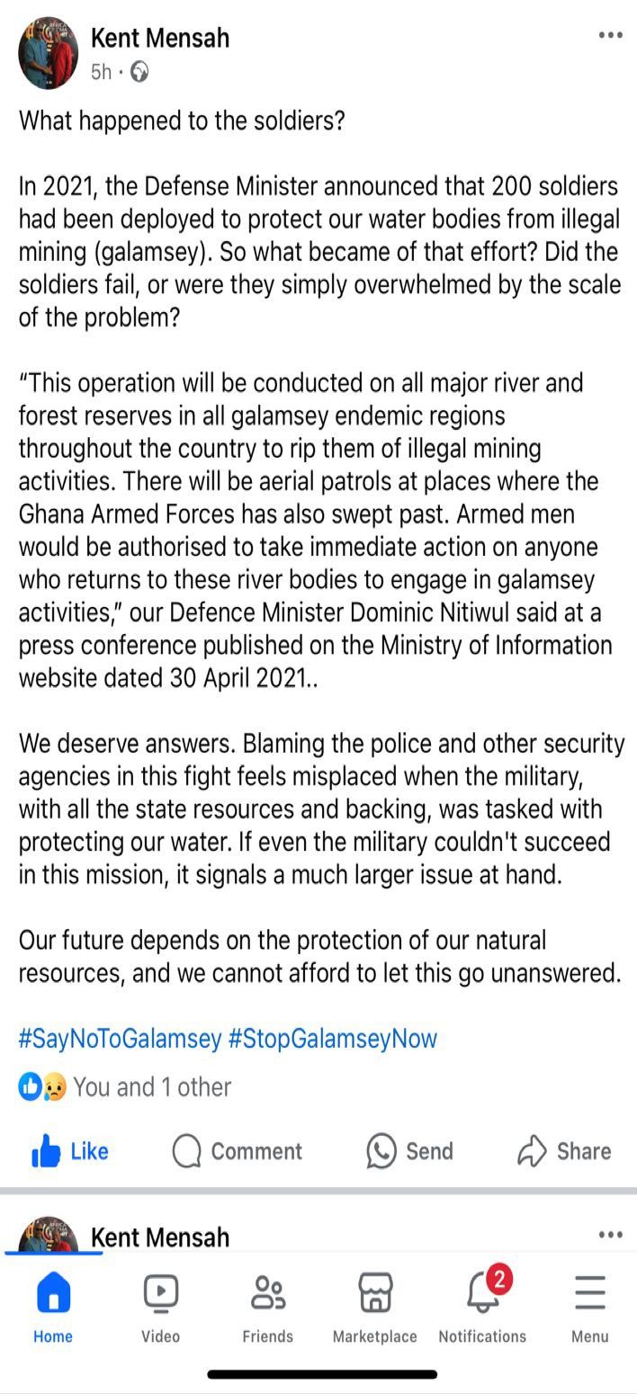 “What happened to the soldiers? In 2021, the Defence Minister announced that 200 soldiers had been deployed to protect our water bodies from illegal mining (galamsey). So what became of that effort? Did the soldiers fail, or were they simply overwhelmed by the scale of the problem?” Mensah wrote in a Facebook post on Tuesday, 8th October 2024.