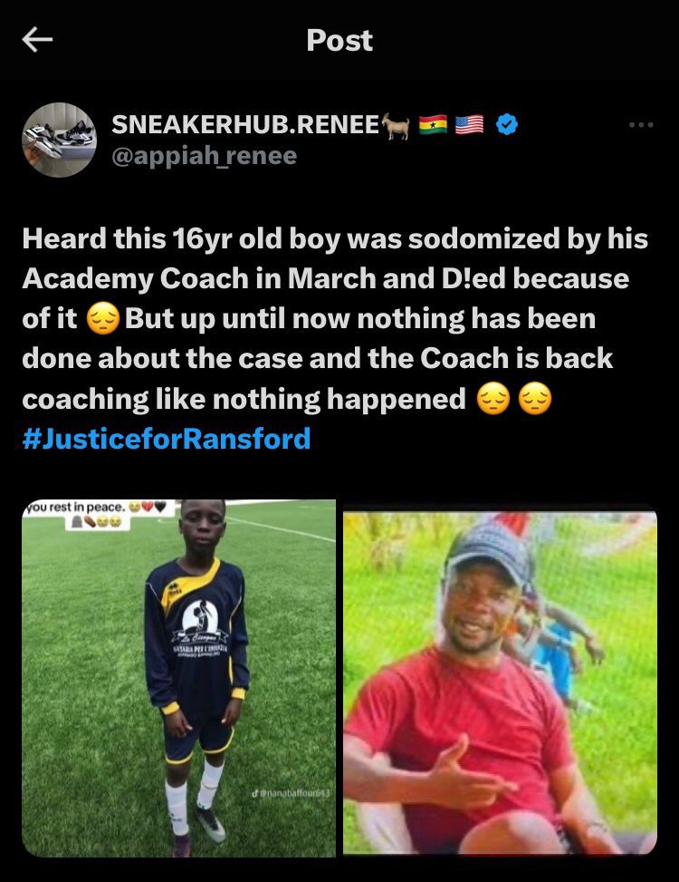According to the petition, Ransford’s ordeal began after he joined the academy, where he was allegedly subjected to prolonged abuse by his coach. The repeated trauma reportedly affected his health and emotional wellbeing, leading to his hospitalisation at the Komfo Anokye Teaching Hospital earlier in 2025. Tragically, he passed away after months of battling the consequences of the alleged abuse.