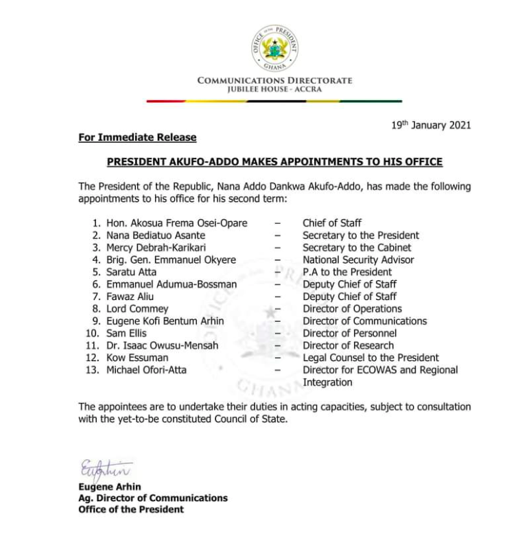 The President also retained Nana Asante Bediatuo as his Secretary in the batch of appointment released by the Presidency Tuesday, Janaury 19, 2021.