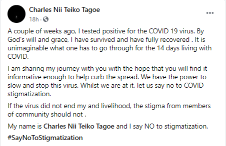 He added that “If the virus did not end my and livelihood, the stigma from members of community should not.”