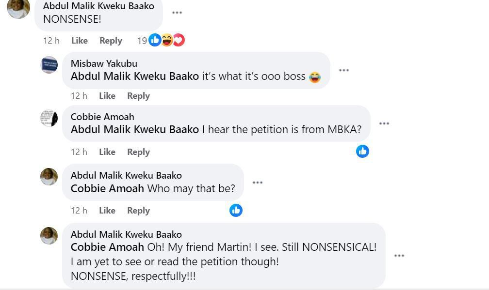 In response, Abdul Malik Kweku Baako remarked, "Oh! My friend Martin! I see. Still nonsensical! I am yet to see or read the petition though! Nonsense, respectfully!!"