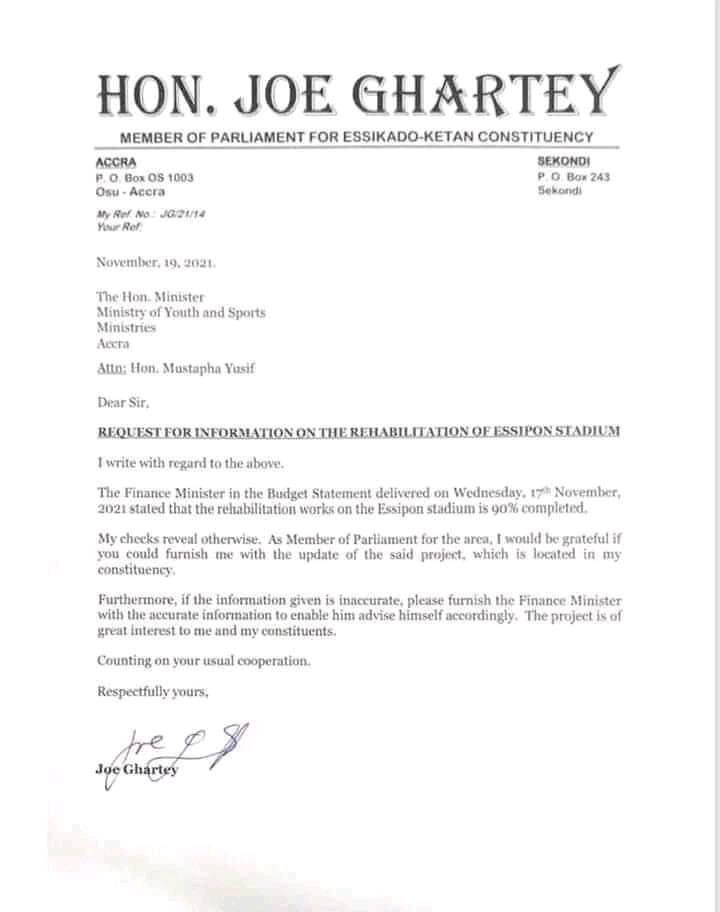 Mr. Ghartey, who himself is a senior member of the governing New Patriotic Party (NPP) in a letter addressed to the Ministry of Youth and Sport is demanding an update on the state of work so far on the Essipon Stadium in his constituency.