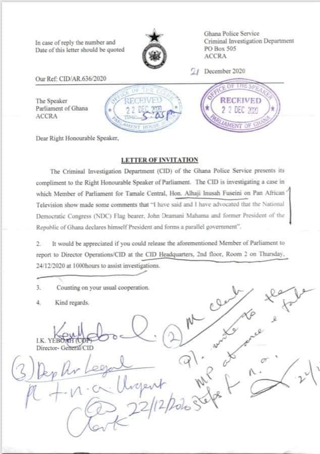 “It would be appreciated if you could release the aforementioned Member of Parliament to report to Director Operations CID at the CID headquarters on Thursday 24/12/2020 at 1000hours to assist investigations,” the CID’s letter to Speaker Aaron Mike Oquaye reads in part.