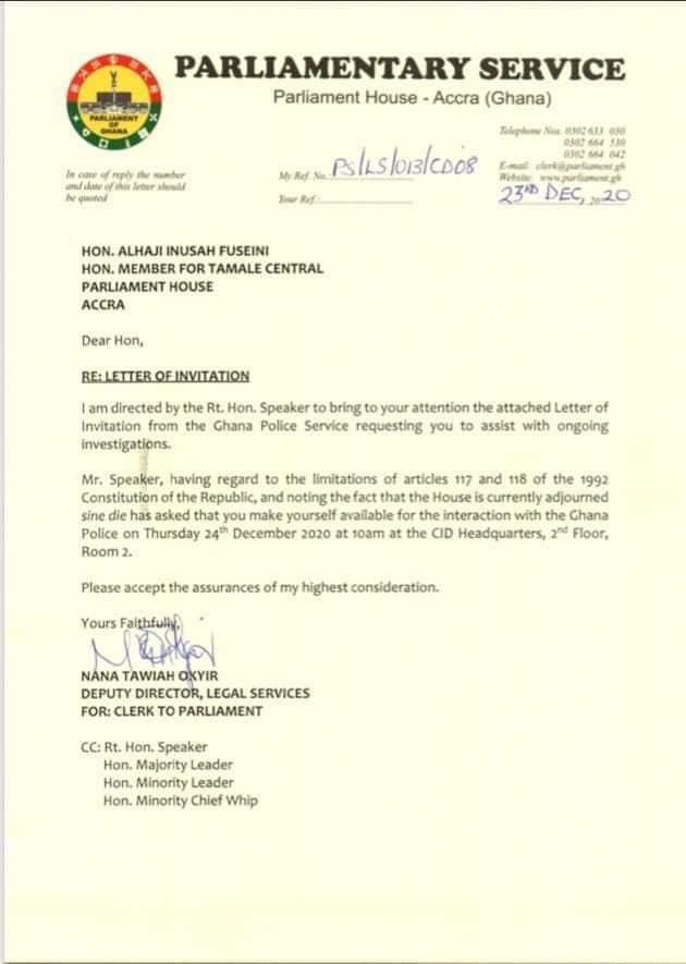 A letter dated December 23, 2020, and address to the lawmaker said “Mr. Speaker having regard to the limitations of article 117 and 118 of the 1992 constitution of the Republic, and noting the fact that the house is currently adjourned sine die, has asked that you make yourself available for the interaction with the Ghana Police on 24th December 2020 at 10 am at the CID headquarters, 2nd floor, room 2.”