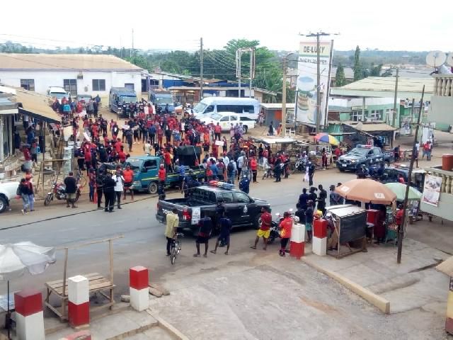 The protestors clad in red and black and wielding placards gathered at the forecourt of the centre close to the lorry station at Asamankese to begin their protest.