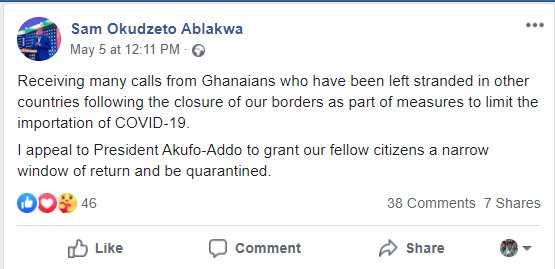 Some Ghanaians stuck in other countries have been calling on the government to facilitate their return or open the borders for a while to allow them to come back.