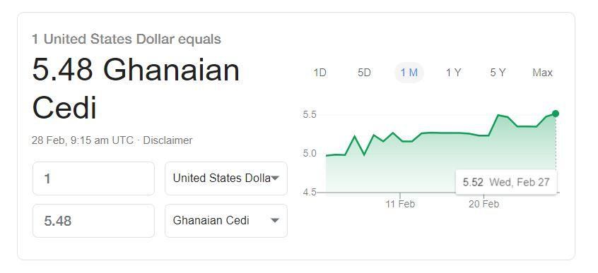 A quick search on Google on Thursday, February 28, 2019, at 11:00GMT showed 1 US dollar is to 5 cedis 48 pesewas while 1 pound sterling is to 7 cedis 29 pesewas.