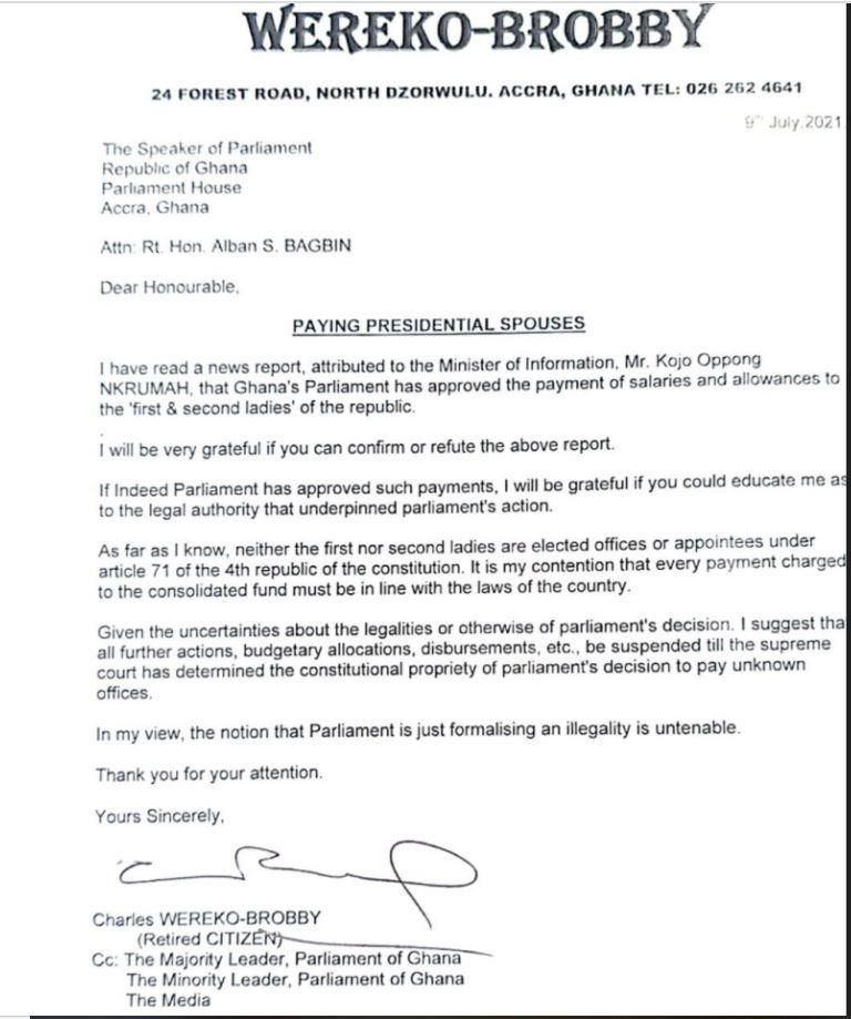 His one-page petition was addressed to the Speaker of Parliament, Alban Bagbin to call on the House to suspend the payment of monthly allowances to incumbent spouses of the President and his Vice.