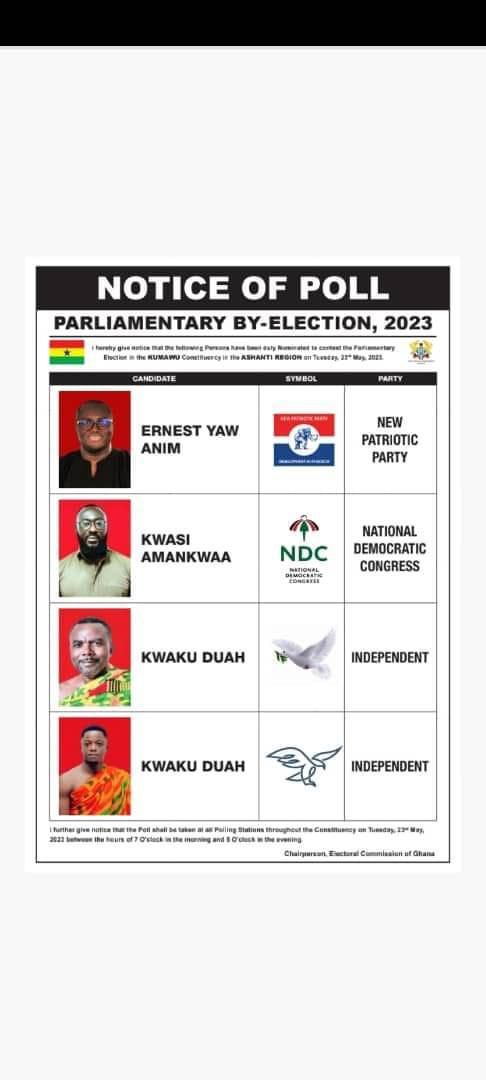 The Electoral Commission has changed the symbol of one of the independent candidates, Kwaku Duah in the <a href="https://www.pulse.com.gh/news/politics/8-pick-nomination-forms-to-contest-kumawu-npp-primaries/r1qnm4r">Kumawu</a> by-election slated for Tuesday, May 23, 2023.