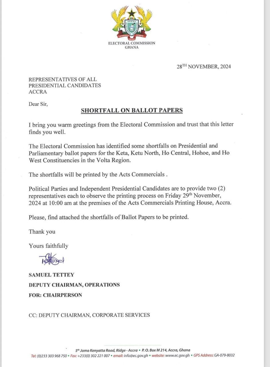 The Electoral Commission (EC) has identified shortages of presidential and parliamentary ballot papers in five constituencies in the Volta Region. This was announced in a statement dated Thursday, 28th November, and signed by the Deputy Chairman in charge of Operations, Samuel Tettey.