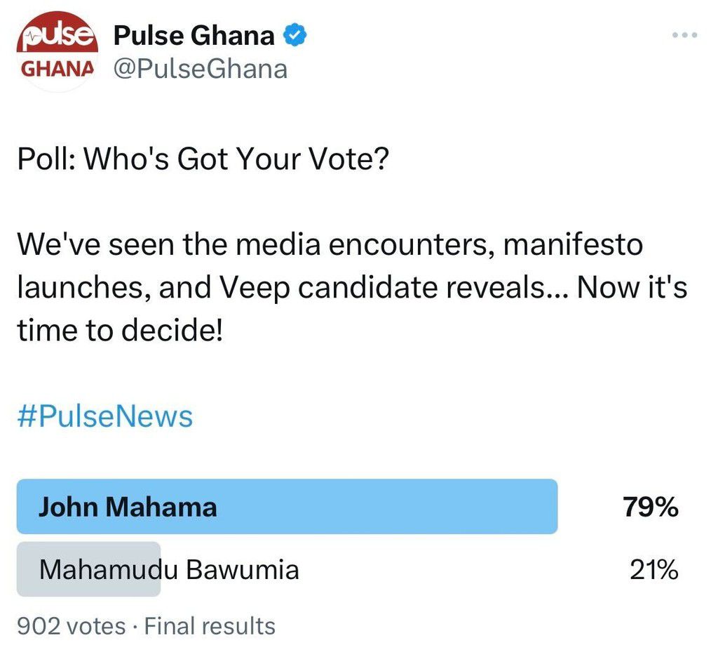Similarly, on X, Mahama garnered 79% of the votes, compared to Bawumia’s 21%. These results suggest a strong preference for Mahama, the flagbearer of the National Democratic Congress (NDC), over his opponent, Dr Bawumia, the New Patriotic Party (NPP) candidate.