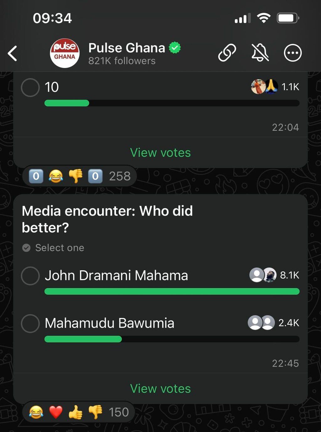 On WhatsApp, out of 10,069 votes cast, Mahama secured 8,208 votes, representing 76.72%, while Bawumia received 2,491 votes, equating to 23.28%.
