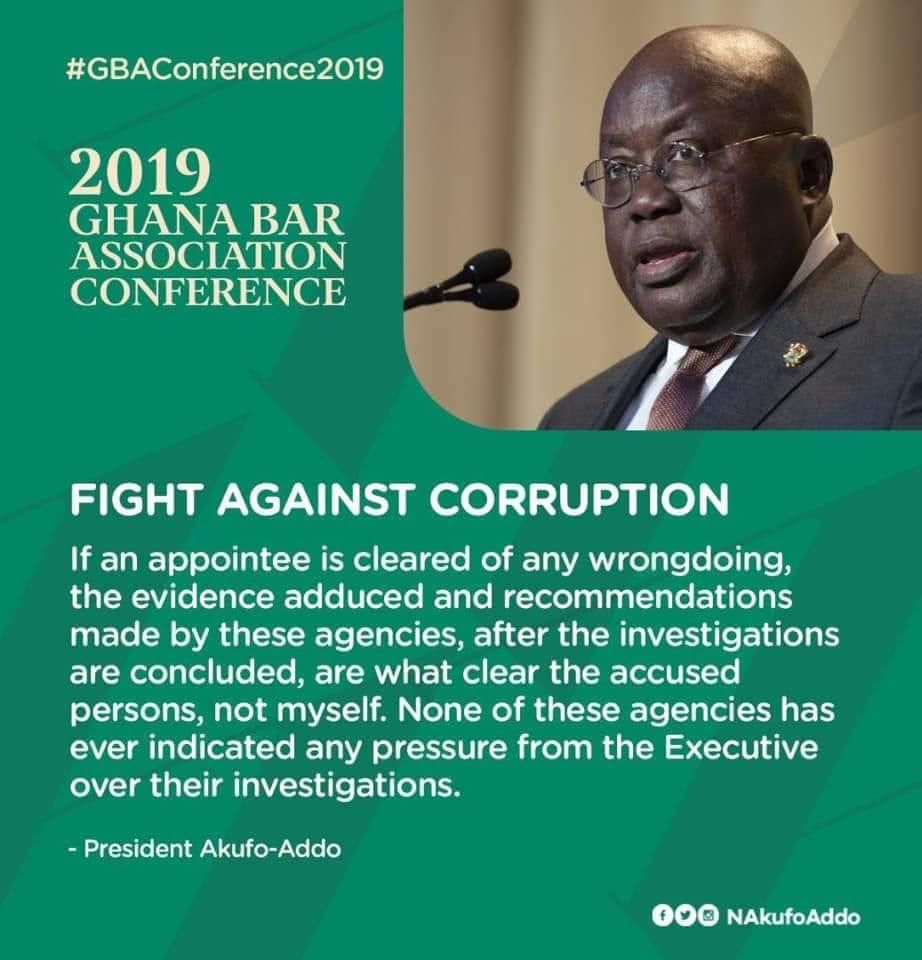 "It is not my job to clear or convict any person accused of wrongdoing, or of engaging in acts of corruption. My job is to act on allegations of corruption by referring the issue or issues to the proper investigative agencies for the relevant enquiry and necessary action. That is exactly what has been done since I assumed the mantle of leadership on 7th January, 2017. If an appointee is cleared of any wrongdoing, the evidence adduced and recommendations made by these agencies, after the investigations are concluded, are what clear the accused persons, not myself. None of these agencies has ever indicated any pressure from the Executive over their investigations," he said.
