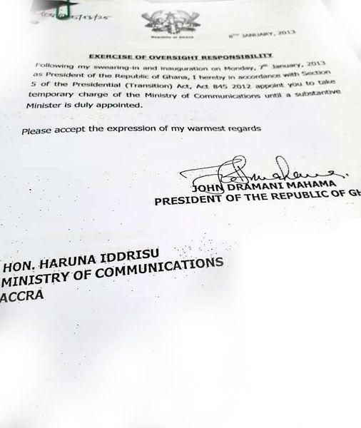According to the letter dated January 8, 2013, Mr. Iddrsu was appointed by former President John Dramani Mahama as an interim minister for communications, but he has described it as illegality when incumbent president Akufo-Addo is doing the same thing now.