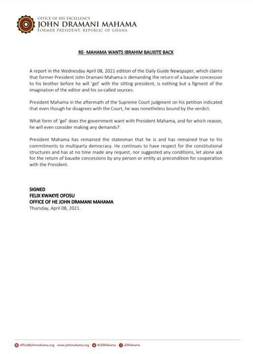This follows a publication in the Thursday, April 8, 2021 edition of the Daily Guide newspaper, which said the 2020 presidential candidate of the main opposition National Democratic Congress (NDC), made the demand as a condition to relate well with President Nana Akufo-Addo.