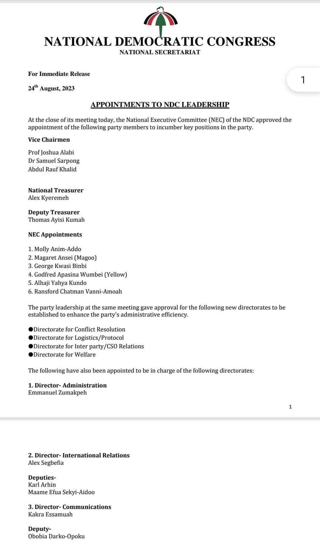 These appointments, aimed at strengthening the party's leadership and effectiveness, were officially announced in a press release signed by Fifi Fiavi Kwetey, the NDC's General Secretary.