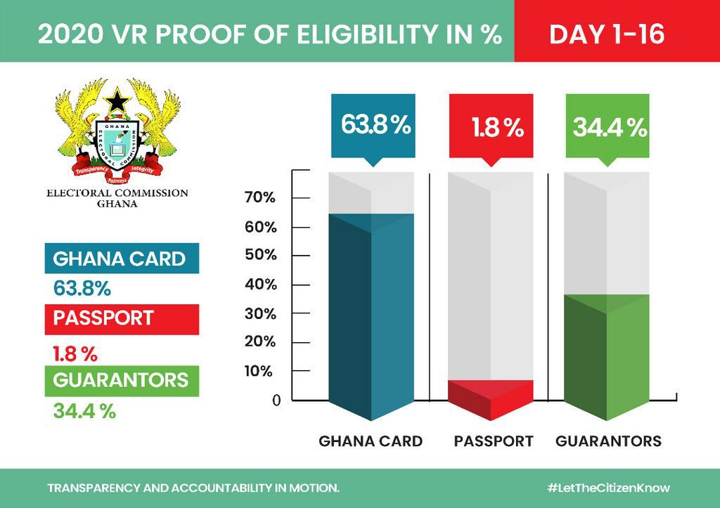 63.8 percent of the registered persons used the Ghana Card, 1.8 percent used the passport and 34.4 percent used guarantors as the modes for identification.