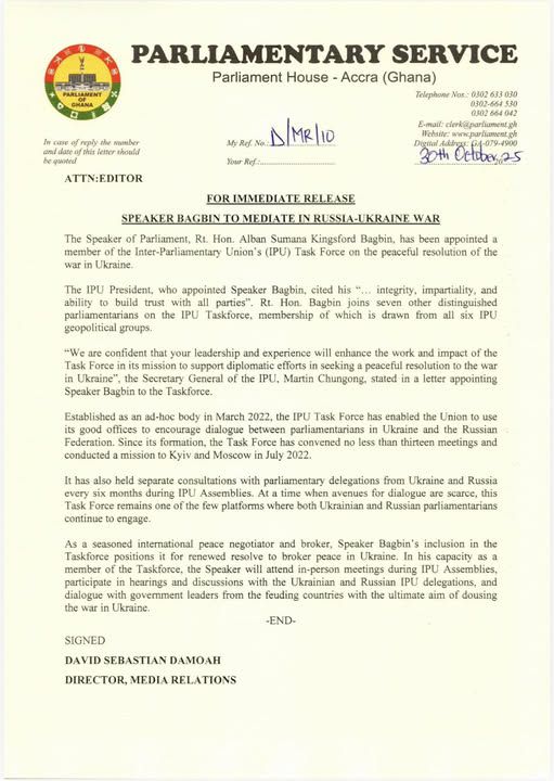 As a seasoned international peace negotiator, Speaker Bagbin’s inclusion in the Task Force reinforces Ghana’s growing reputation for supporting global peacebuilding efforts. In his new role, he will participate in IPU meetings, engage in direct dialogue with Russian and Ukrainian lawmakers, and collaborate with global leaders in the ongoing quest for peace in Ukraine.