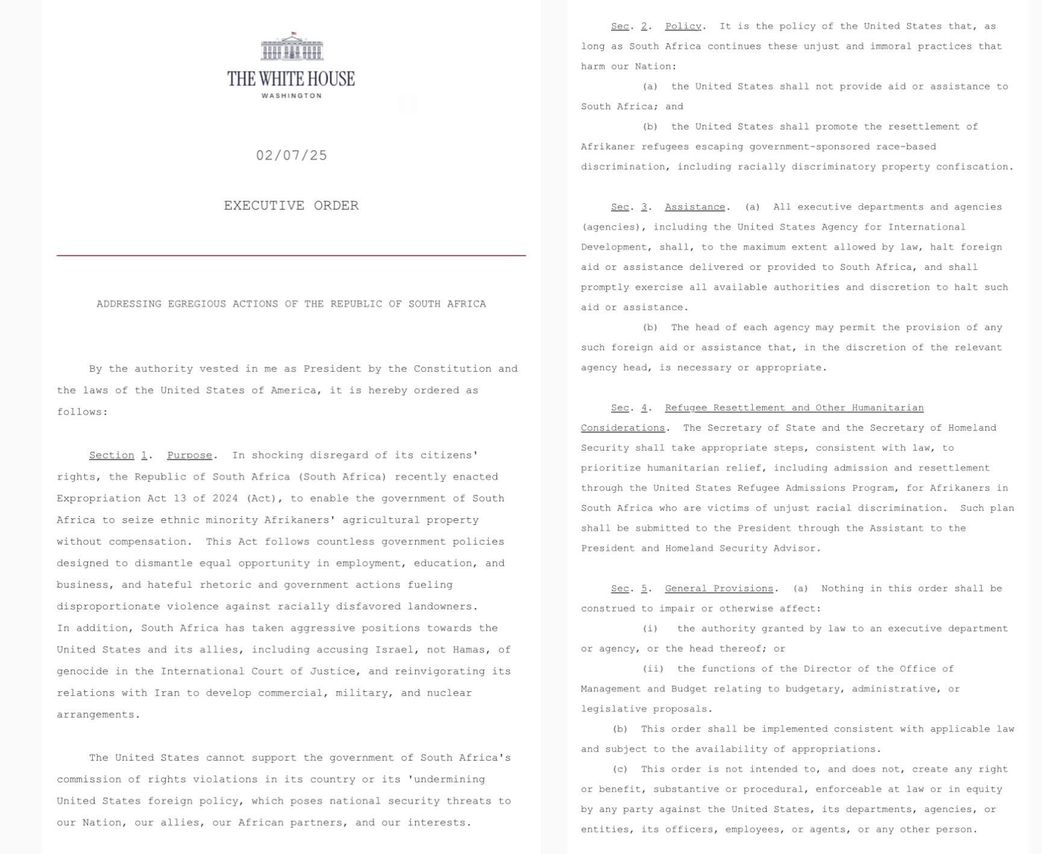 The executive order stated that the US will not support South Africa's human rights violations and will withhold funding until they end.