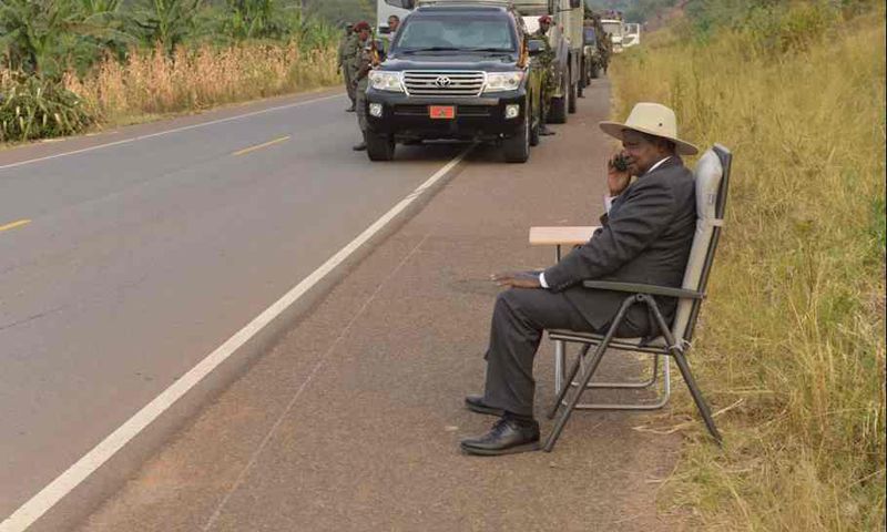 The president was reportedly on his way to a public function in the South West district of Isingiro when his motorcade stopped and a padded folded seat was availed Museveni to make a 30-minute phone call.