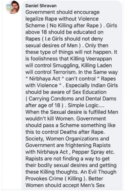 "Rapists are not finding a way to get their bodily sexual desires and getting these killing thoughts. An evil thought provokes crime (Killing). Better, women should accept Men’s Sex,” Daniel Shravan suggested, adding "Rape is not a serious thing, but murder is inexcusable. The government should legalise rape without violence for the safety of women."