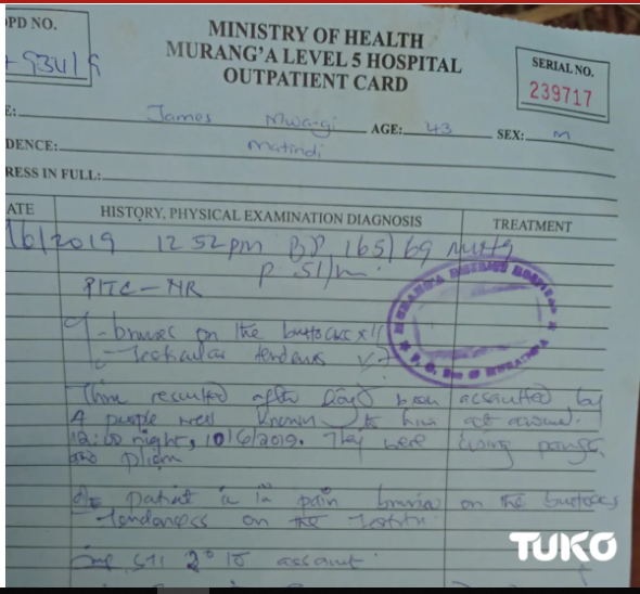 "I was helpless. My wife and my mother wailed loudly as they pleaded with them not to continue assaulting me. They had kept a distance fearing the officer who held a gun on his hand could fire at them," James Mwangi Kinyanjui further narrated tearfully.