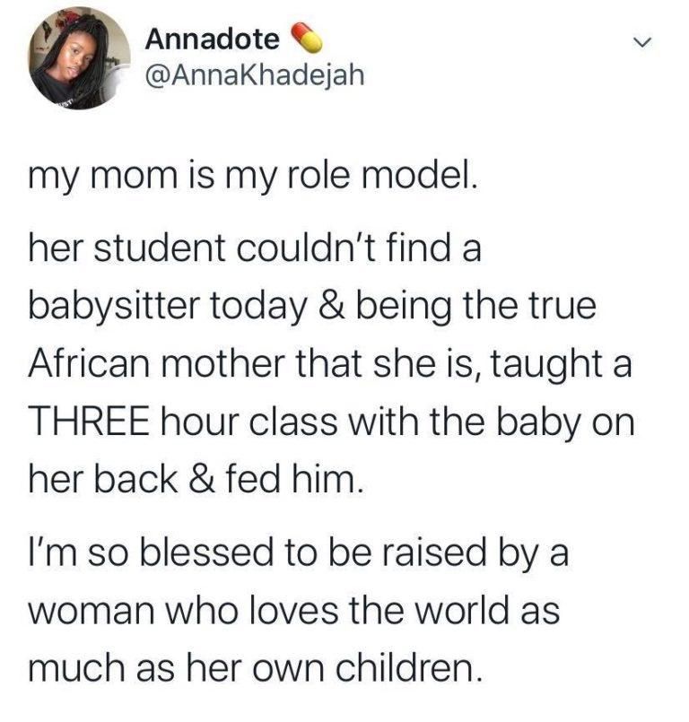 Her inspired daughter who shared the kind gesture on Twitter wrote: “My mom is my role model. her student couldn’t find a babysitter today & being the true African mother that she is, taught a THREE-hour class with the baby on her back & fed him. I’m so blessed to be raised by a woman who loves the world as much as her children.”
