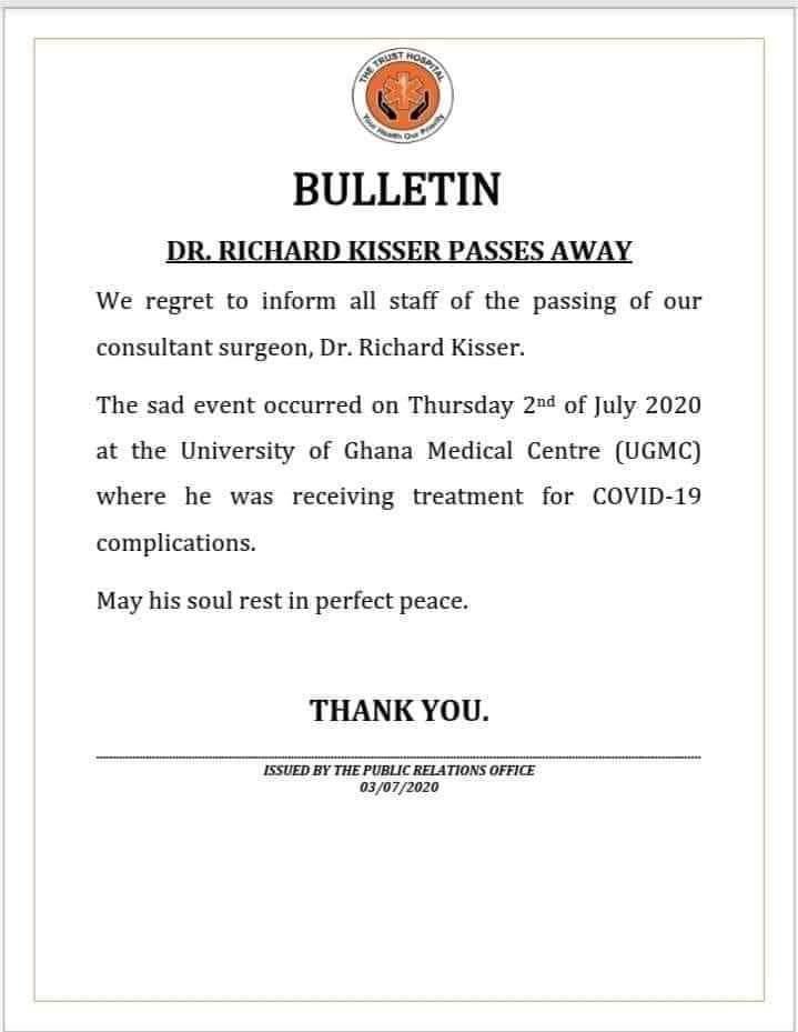 “We regret to inform all staff of the passing of our consultant surgeon, Dr. Richard Kisser. The sad event occurred on Thursday 2nd of July 2020 at the University of Ghana Medical Centre (UGMC) where he was receiving treatment for COV1D-19 complications. May his soul rest in perfect peace,” the facility noted.